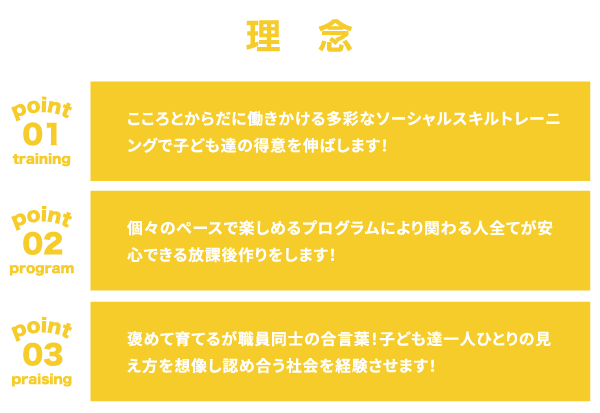 日々の子育てでお疲れの親御さん、毎日仕事で忙しい親御さんが安心してお子さんを預け、悩みや相談事を気軽に話すことのできる憩いの場でもありたいと思っています。